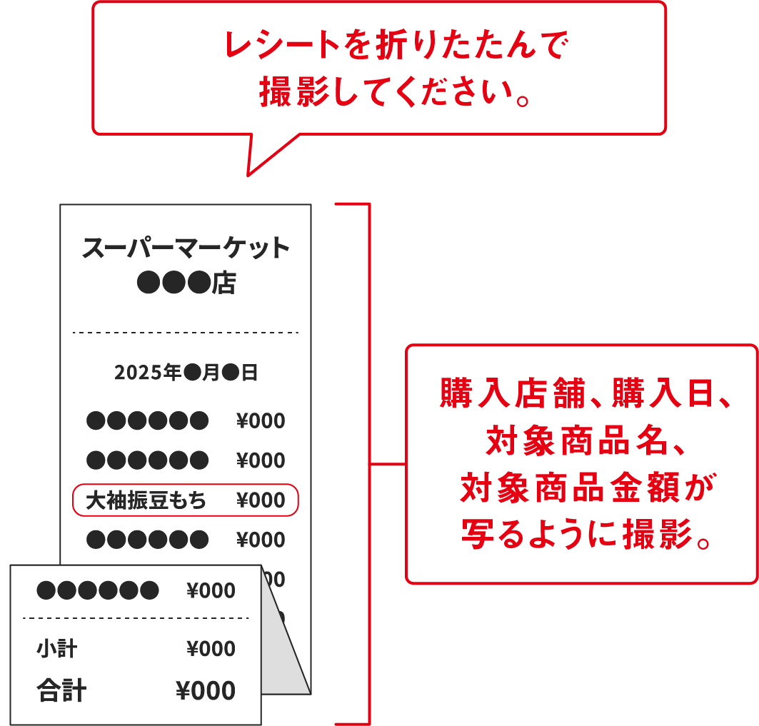 - ●長い購買証明は、必要情報(購入店舗、購入日、対象商品名、対象商品金額)が確認できるよう、不要な情報部分を折り込んで撮影してください。