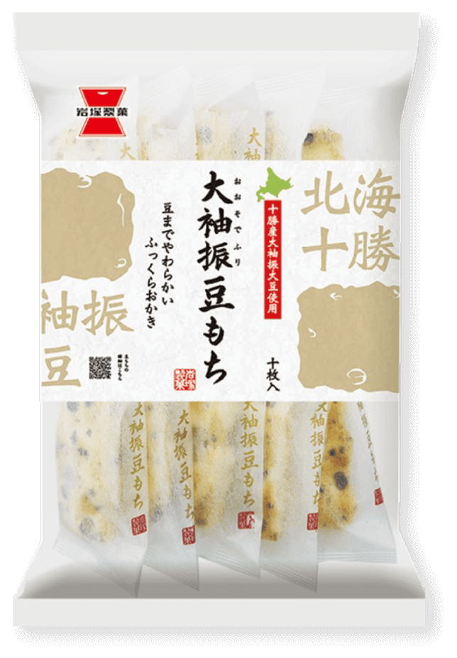 「大袖振豆もち」の豆は、音更町のブランド大豆「音更大袖振大豆」だけを使用しています。大粒で風味がよく、栄養価も高いという特徴を持つ一方、他の品種に比べて栽培が難しく、大量生産に向かない希少性の高い大豆です。「音更大袖振大豆」へのこだわりが、大袖振豆もちの美味しさを生み出しています。